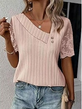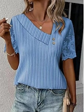 Highlights [Fabric and Fit] : Crafted from high-quality polyester, this women's blouse offers a textured, ribbed fabric that ensures both comfort and breathability, perfect for warm summer days. The fit is elegantly tailored to provide a relaxed yet flattering silhouette. [Design Highlights] : Featuring an asymmetrical neckline accented with decorative buttons, this blouse embodies sophistication and elegance. The short sleeves are adorned with intricate floral lace, adding a feminine touch to the overall design. [Occasions] : This versatile top is ideal for daily wear, seamlessly transitioning from casual outings to more refined, semi-formal events. Pair it with jeans for a laid-back look or with a skirt for a chic, polished appearance. [Size Range] : Available in a range of sizes from S to 3XL, this blouse accommodates a variety of body types, ensuring a perfect fit for every woman. [Additional Details] : The blouse's sophisticated aesthetic makes it a staple piece that adds a special charm to any wardrobe. Perfect for everyday use. excellent materials and excellent craftsmanship ensure long-lasting durability.