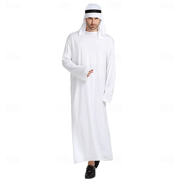 : Featuring a vintage round neckline and long sleeves, the costume embodies timeless Middle Eastern style. The accompanying matching white headscarf, secured with a black headband, adds an authentic touch to this ensemble.