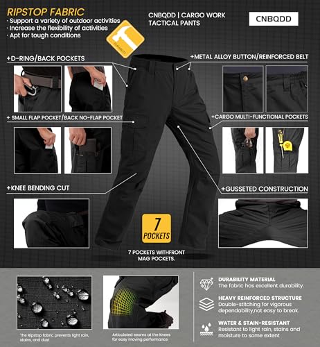 Fabric type: 65% Polyester, 35% CottonOrigin: ImportedClosure type: SnapInseam: 30 Inches【Ripstop Fabric】: These mens work pants are crafted from ripstop fabric which has excellent durability and has water-resistant and stain-resistant. The fabric is breathable, relaxing, resistant to wrinkles, avoids fade, durable and scratch-resistant.【7 Pockets】: Designed with functionality in mind, these tactical pants for men features 7 pockets to carry a variety of tools and equipment without having to hold them in your hands.【Ergonomic Design】: The articulating design at the knees and triangle area at gusseted crotch allows for maximum flexibility and ease of movement. Whether bending, kneeling, half squat,or performing any dynamic activity, these men's cargo pants offer unparalleled comfort and freedom.【Multi-Stitching Details】: Key areas such as the waistband, pockets, and crotch are reinforced with multi-layer stitching, ensuring exceptional durability and practicality. This design provides extra protection against tears and wear, perfect for active use in tough conditions.【Occasion】: CNBQDD work pants are perfect for any indoor and outdoor activities, such as working, hiking, camping, fishing, tactical training, climbing, shooting and hunting. Perfect for everyday use. excellent materials and excellent craftsmanship ensure long-lasting durability.