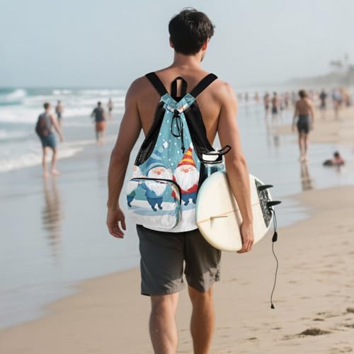 Mesh Gym Swimming Bags for Men & Women, Christmas Gnomes Snow Winter Large Drawstring Backpack with Dry-Wet Pocket, Lightweight Gym Bag for Sports, Travel, Beach, Workout Gear
